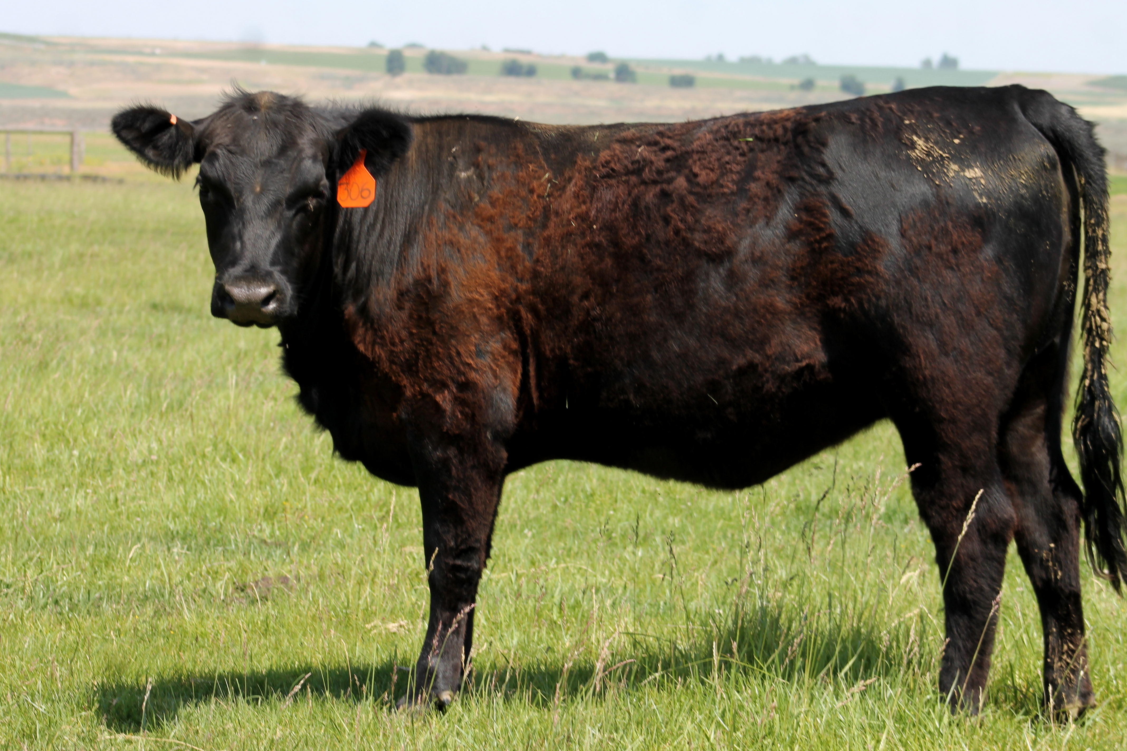BK Susie 306 is another great heifer by SAV 004 Predominant 4438 and is out of a BK 1241 Expand 520 daughter. Predominant is a bull that is putting quality back into cow herds. He’s a moderate framed bull with loads of muscle and volume making great, easy fleshing cows. Predominant was one of the high selling bulls in the record setting 2005 Schaff Angus Valley Sale where he competed well with a 100 half brothers. While keeping birth weights low, his calves have great thickness and ratio 101 for weaning and 102 for yearling weight. In addition, they are neat through the front end and have superior structure and phenotype. His dam is one of the top donors in the SAV program. 306′s dam, 807, is by a great herd bull that we raised and used for a few year and then sold to Elwyn Fletcher. He was a bull that produced some tremendous heifers and bulls. 807′s dam is a B/R Frontrange 052 daughter. 306 is Jaxsen’s heifer that he named “Noisy.”This heifer was born 1/7/13