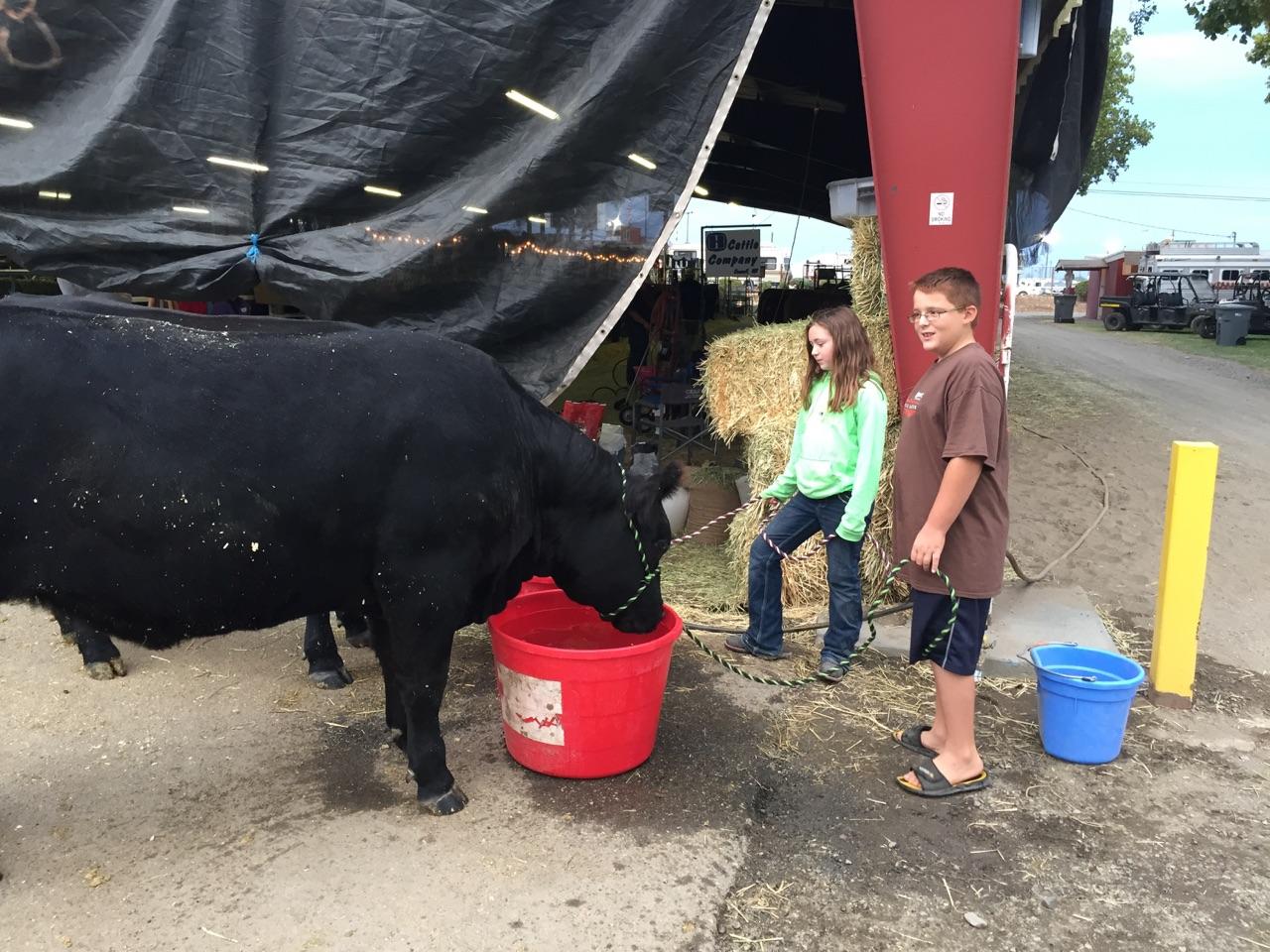 Life at the fair August 29, 2015horseshoeangusranch Anna and a 4H member, Kelten, watering their steers. Share this: Click to share on X (Opens in new window) X Click to share on Facebook (Opens in new window) Facebook Click to print (Opens in new window) Print Click to email a link to a friend (Opens in new window) Email Click to share on LinkedIn (Opens in new window) LinkedIn Like Loading... Related