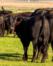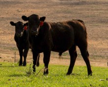 2 Year old Angus cow with black Hereford bull at side.